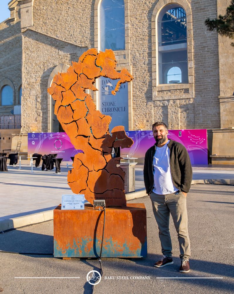 На симпозиуме «Baku Steel Art 2025» Гюрсел Алемшахов представил работу под названием «Нет воды, нет жизни». «В этой композиции показано, как земля растрескивается и разламывается от жажды. Трещины - не только зеркало природы, но и отражение будущего человечества. Эта композиция, созданная из твёрдого железа, увековечивает важность воды и трагедию её отсутствия. Каждый фрагмент композиции напоминает нам о ценности капли воды: когда заканчивается вода, заканчивается и жизнь. Каждая деталь напоминает зрителю о том, что необходимо всегда поддерживать хрупкое равновесие в природе.
