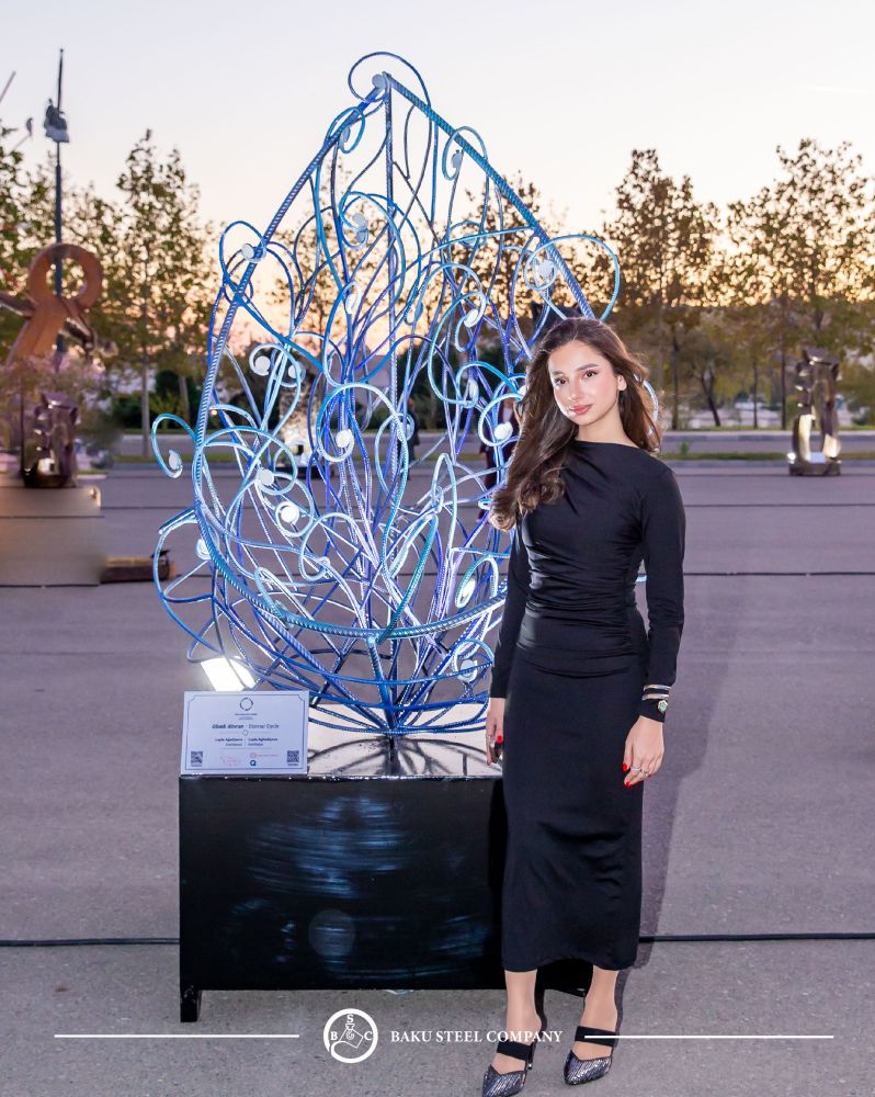 Leyla Ağadiyeva “Baku Steel Art 2025“ simpoziumunda “Əbədi dövran“ adlı əsər yaradıb. ““Əbədi Dövran“ - həm damla, həm də yarpaq formasında su ilə təbiəti - həyatın iki əsas başlanğıcını birləşdirən arxetipik bir simvol kimi qurulub. Damla - planetin yaddaşını və enerjisini daşıyan başlanğıcdır. Yarpaq - Yer kürəsinin nəfəsi, suyun daşıyıcısı və tarazlığın rəmzidir, özündə yenilənmənin, böyümənin və saflığın qüdrətini daşıyır.